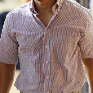 Seersucker all year long in a classic red, white, & blue seersucker shirt. Subtle, lightweight, and a texture they begs a second look.