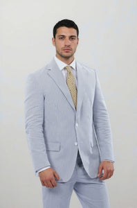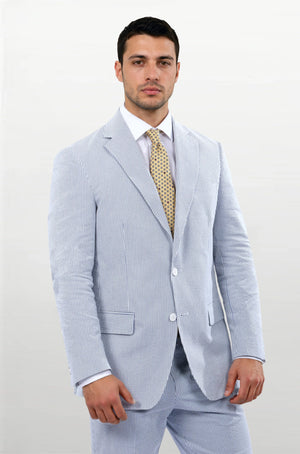 97% Cotton / 3% Lycra Haspel Exclusive Seersucker Stretch Fabric •Maximized Seersucker Pucker •Natural Shoulder • Two Buttons • Flap Pockets • 3/4 Lined for Maximum Cool • Side Vents • Notch Lapel • Dry Clean