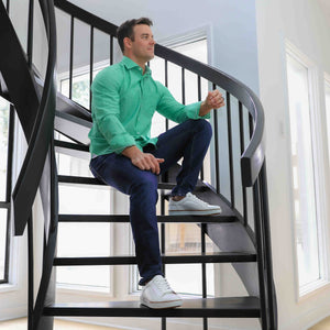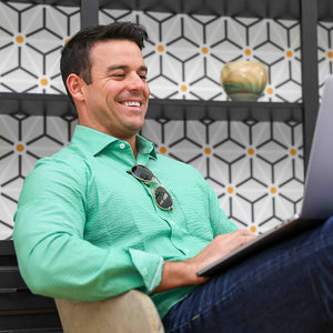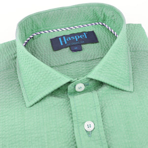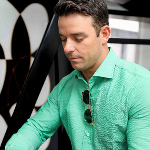 A solid look for a solid guy. The most perfectly green shirt soon to be on your statuesque frame. Seersucker, lightweight, and supremely cool.