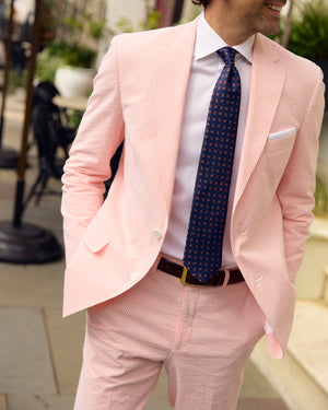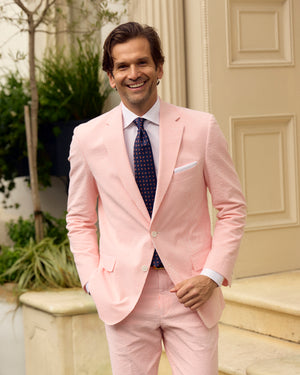 97% Cotton / 3% Lycra Haspel Exclusive Seersucker Stretch Fabric • Maximized Seersucker Pucker • Audubon Classic Fit • Natural Shoulder • Two Buttons • Flap Pockets • 3/4 Lined for Maximum Cool • Side Vents • Notch Lapel • Dry Clean