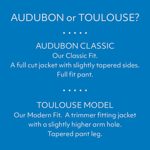 • Audubon Classic Fit – Our Classic Fit. A full cut jacket with slightly tapered sides.  Full fit pant.