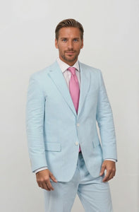 Have a Bombay-tastic time in this stretchy aqua seersucker sport coat that pairs perfectly with our suit separates. Whether you're enjoying a refreshing sea breeze or the horizon of the real seaside, this look will have you looking classically styled and ready for a good time.
